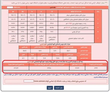 - مقایسه با کارنامههای قبولی سالهای گذشته: مقایسه کارنامه خود با کارنامههای قبولی رشتهها و دانشگاههای مورد نظر در سالهای گذشته، میتواند به شما کمک کند تا شانس قبولی خود را ارزیابی کنید و انتخابهای واقعبینانهتری داشته باشید.